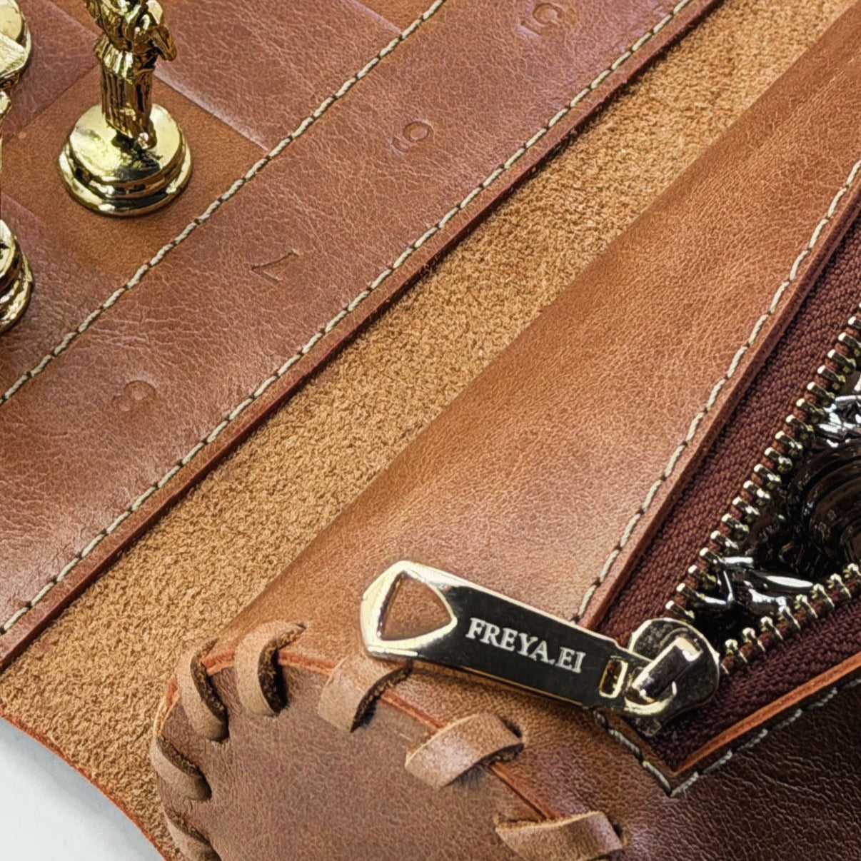 Her detayında özenle işlenmiş doğal deri yüzey, antik bronz ve gümüş tonlarındaki özel metal figürlerle birleşerek zamansız bir tasarım sunar.