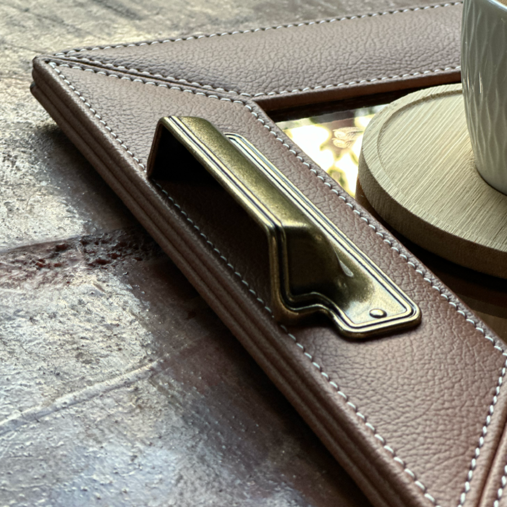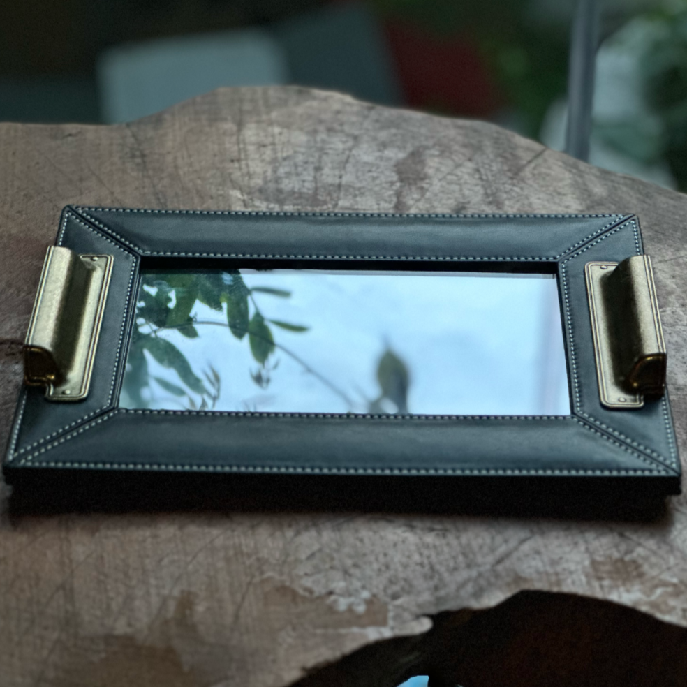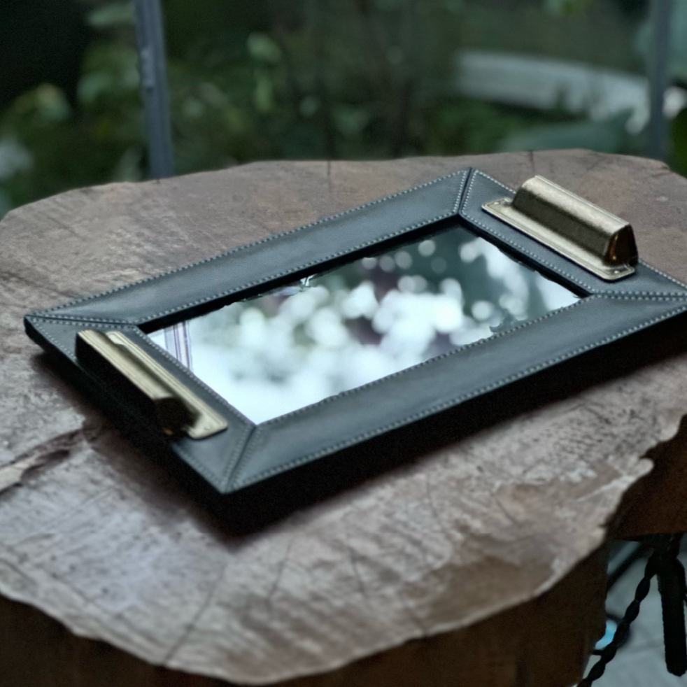 A: Bu özel tasarım tepsi, yüksek kaliteli suni deriden üretilmiştir. Orta kısmında dekoratif amaçlı bir ayna bulunmakta ve kulpları el yapımı özel işçilikle detaylandırılmıştır.