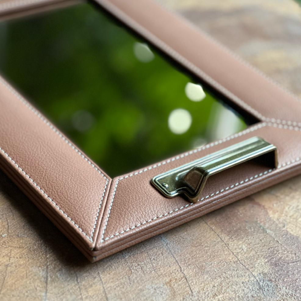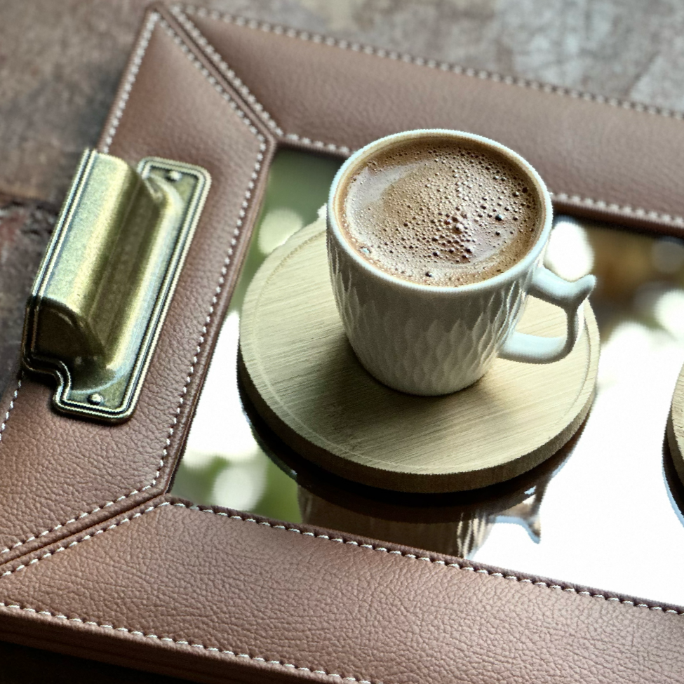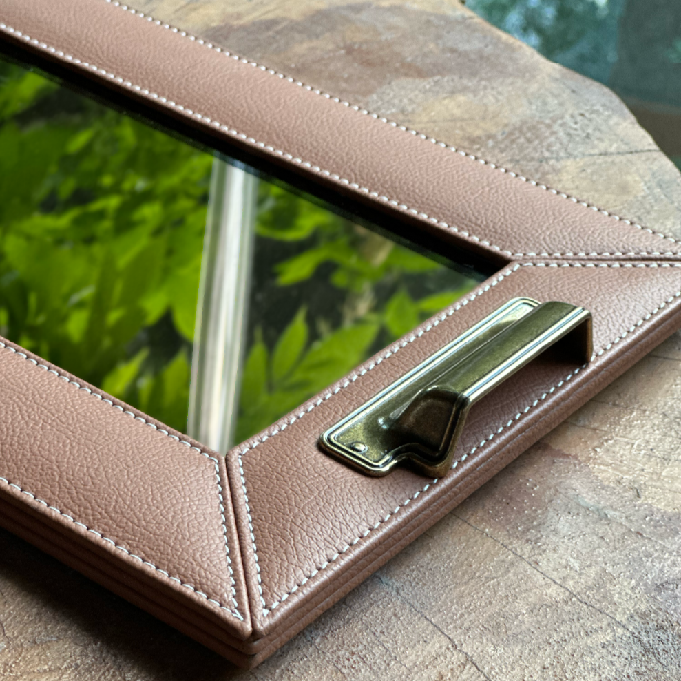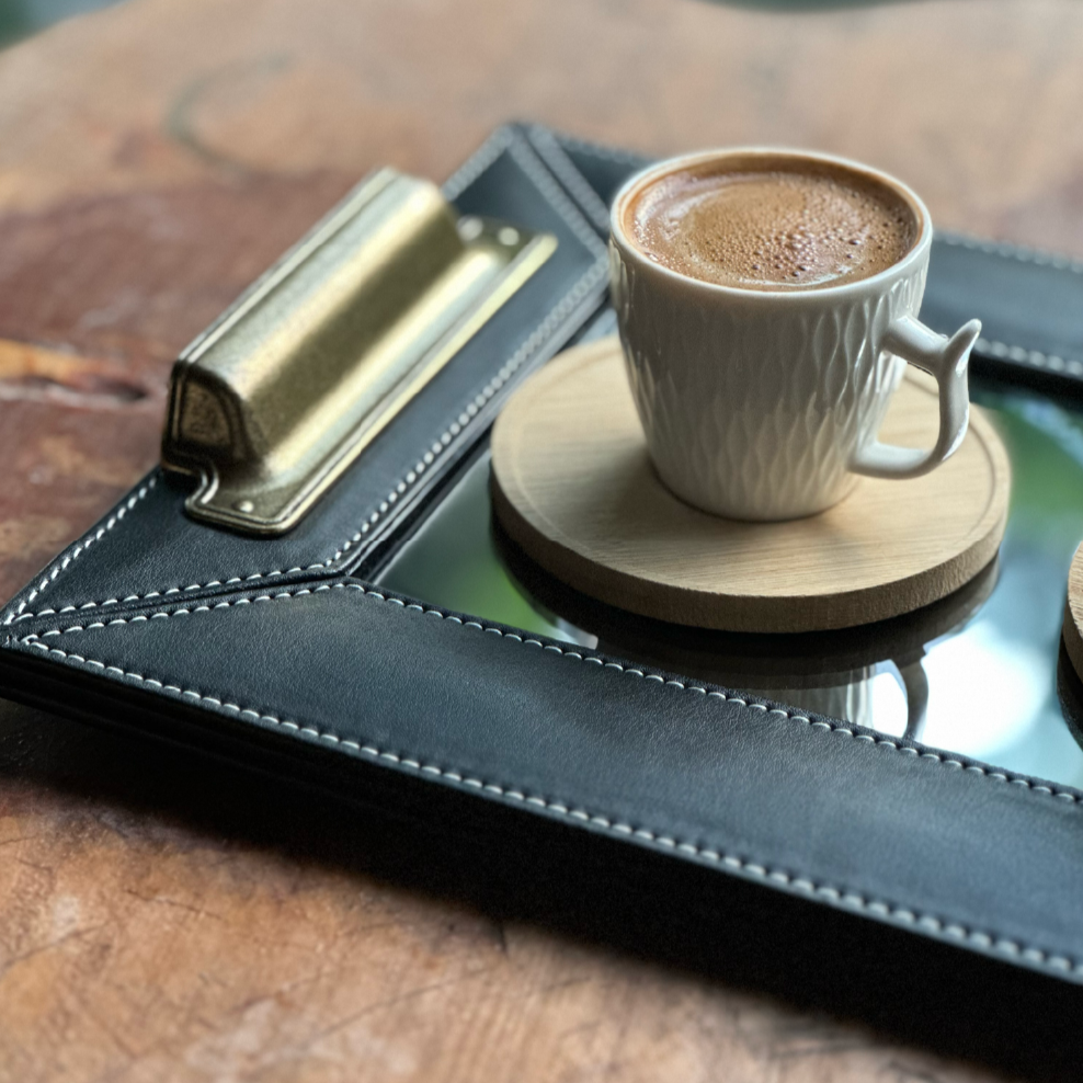 A: Bu özel tasarım tepsi, yüksek kaliteli suni deriden üretilmiştir. Orta kısmında dekoratif amaçlı bir ayna bulunmakta ve kulpları el yapımı özel işçilikle detaylandırılmıştır.